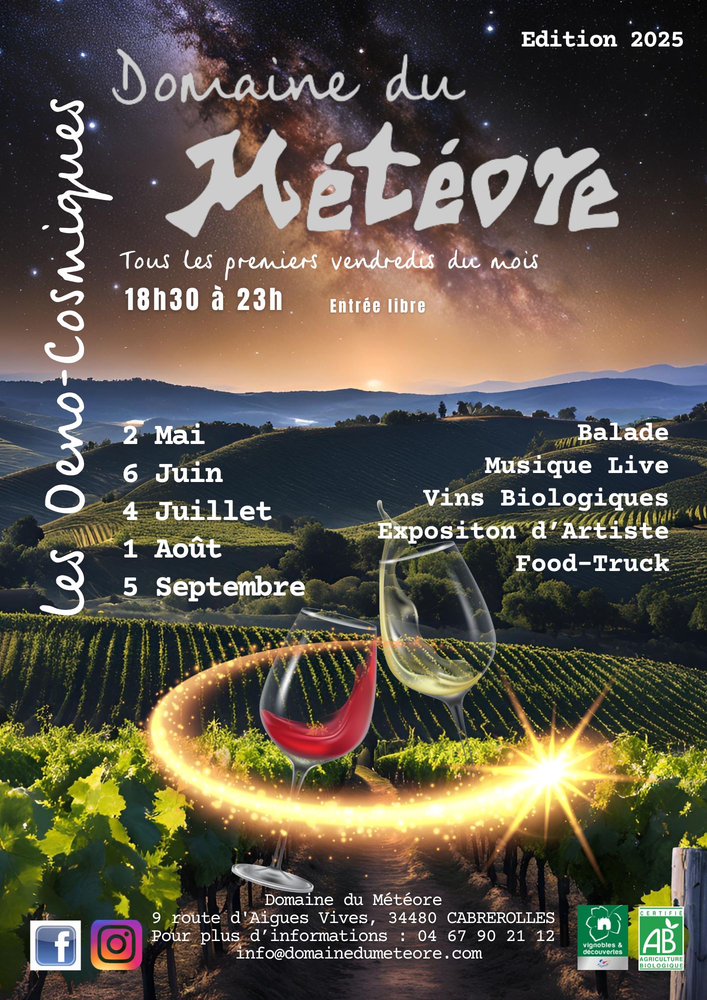 Comme chaque année, nos soirées « Œno-Cosmiques » ont lieu le premier vendredi de chaque mois de mai à septembre.