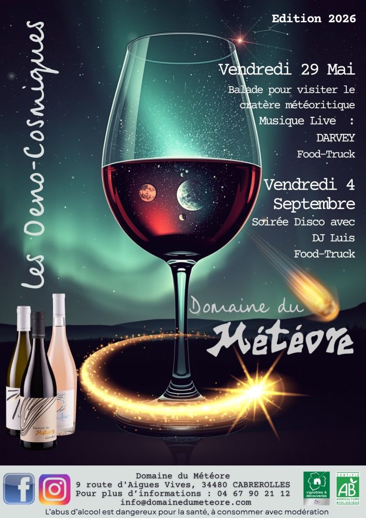 Le vendredi 29 mai ainsi que le vendredi 4 septembre nous vous invitons au Domaine du Météore à partager une soirée festive où se conjuguent la musique, la peinture ou sculpture et le vin. Vous aurez la possibilité en début de soirée de visiter le cratère de Météorite lors d'une balade d'environ une demi-heure. De retour au domaine vous pourrez déguster les vins de votre choix accompagné d'un repas servi par un food truck séléctionné par nos soins.
